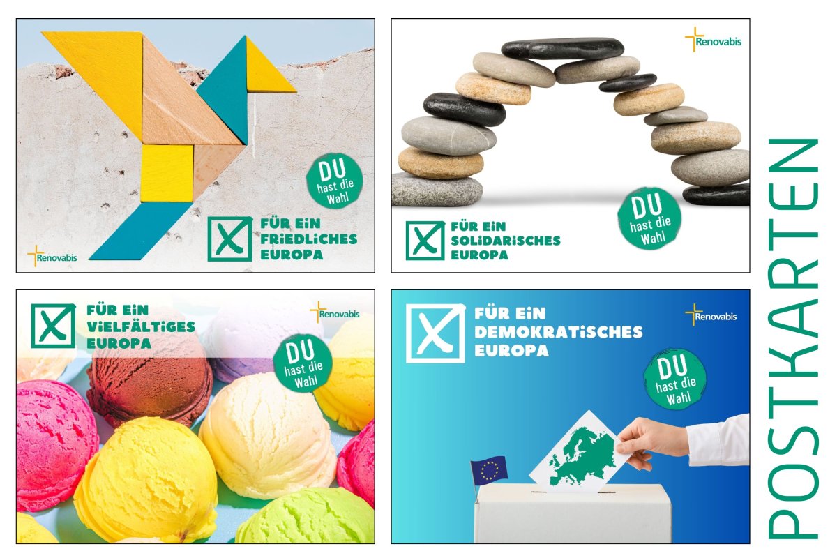 Renovabis lädt ein, sich bei der Europa-Wahl für ein vielfältiges, demokratisches, solidarisches und friedliches Europa stark zu machen. Weil das wichtig ist, haben wir vier inspirierende Postkarten vorbereitet – verschicken Sie an Familie, Freundinnen und Freunde eine kleine Erinnerung an die Wahl. Sie können ein Set mit diesen vier Karten bei unserem Versanddienstleister, der MVG, bestellen: Best.-Nr.: 7 426 24.
