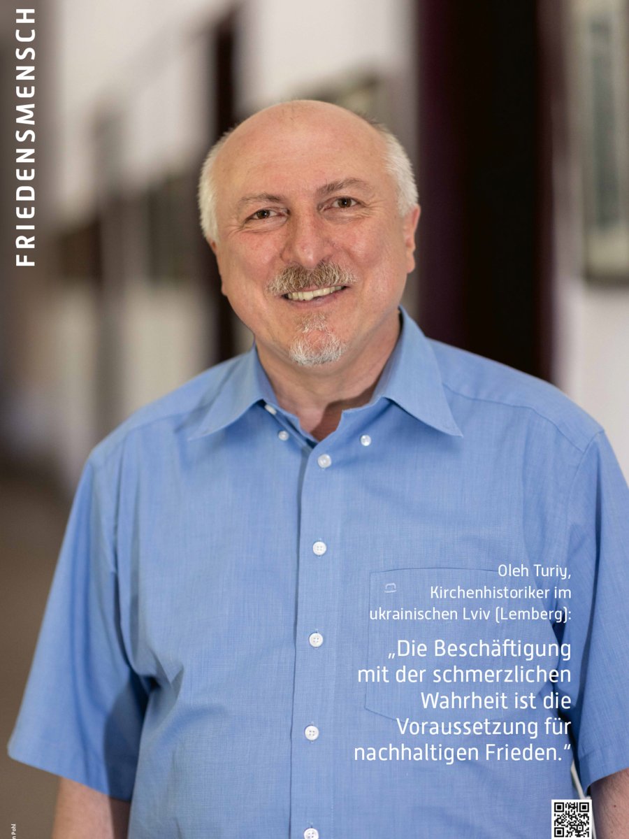 Oleh Turiy ist Direktor des Instituts für Kirchengeschichte an der Ukrainisch Katholischen Universität in Lviv (Lemberg). Mit seinen Mitarbeitenden führte er etwa 2000 Interviews mit Zeitzeugen für sein Werk über die Unterdrückung der griechisch-katholischen Kirche in der Sowjetzeit. „Die Aufarbeitung der Vergangenheit steht in der Ukraine noch ganz am Anfang. Und unter einer russischen Besatzung wäre sie ganz unmöglich“, erklärt Turiy. „Ich bin fest davon überzeugt, dass die Beschäftigung mit der schmerzlichen Wahrheit die Voraussetzung für nachhaltigen Frieden ist.“ Der 59-jährige Kirchenhistoriker war während seiner Forschung immer wieder beeindruckt von der Glaubensfestigkeit der ukrainischen Kirche.„Die griechisch-katholischen Gläubigen haben in der kommunistischen Zeit am meisten gelitten, weil sie den Papst als Oberhaupt anerkennen. Aber trotz aller Verfolgung sind die meisten standhaft geblieben.“