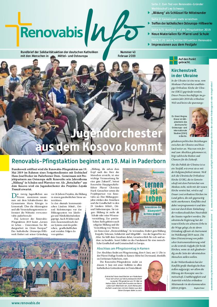 Renovabis-Info ist der Rundbrief von Renovabis. Neben Projektberichten und Informationen über Länder und Leute im Osten Europas finden Sie hier auch Artikel über die Partnerschaftsarbeit sowie Nachrichten und Veranstaltungshinweise.