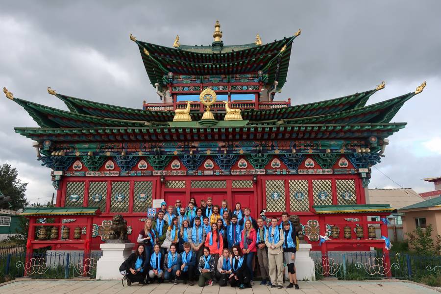 Von Ulan-Ude, der burjatischen Hauptstadt, fuhren wir zum Dazan - einem buddhistischen Kloster außerhalb der Stadt, dort befindet sich auch eine Universität. Wir wurden auf traditionell burjatische Weise mit blauen Schals im Kloster empfangen. Auf einer Führung wurden wir zunächst mit dem Gelände vertraut gemacht. Dort stehen mehrere Tempel und Mantras. Danach gab es traditionelles burjatisches Essen. Im Anschluss erklärte uns ein Mönch die Grundzüge des Buddhismus und des buddhistischen Studienprogramms der Universität. Am Abend dann ein großes Abschlussprogramm im Hostel - und nicht zu vernachlässigen: die Abschlussparty!