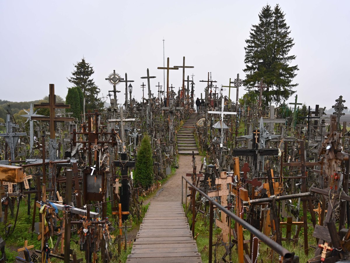 Die Besonderheit der geographischen und politischen Lage Litauens wurden den Gästen aus Augsburg spätestens am „Berg der Kreuze“ in Šiauliai hautnah vor Augen geführt. Der ursprünglich auf Legenden beruhende Wallfahrtsort wurde seit dem 19. Jahrhundert zunehmend zum Symbol des nationalen Widerstands gegen die kommunistische Herrschaft der Sowjets, wie Pater Severin (OFM) vom angeschlossenen Franziskanerkloster zu berichten wusste. Eine schmale Treppe aus Holzbohlen führt den kleinen Hügel bergan. Links und rechts säumen unzählbar große und kleine Kreuze den Weg, Rosenkränze und Engel hängen an Bäumen und Pfeilern. „Der Berg wurde zum Realsymbol für den Glauben und die Freiheit Litauens“, so der weit über 80-jährige Franziskanerpater zur besonderen Bedeutung des Ortes.