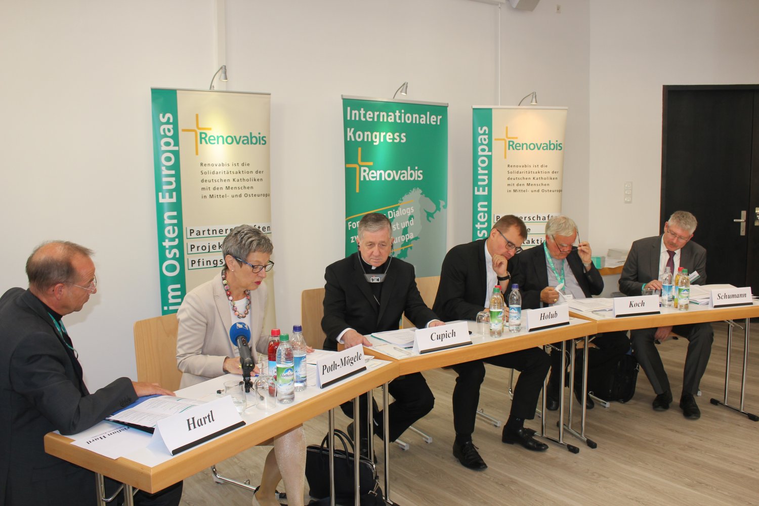 Bei der Pressekonferenz im Vorfeld waren mit dabei: v.l.n.r. Pfarrer Christian Hartl (Renovabis), Angelika Poth-Mögele (Rat der Gemeinden und Regionen Europas), Blase Kardinal Cupich (Erzbischof von Chicago), Bischof Tomáš Holub (Bischof von Pilsen) und Erzbischof Heiner Koch (Erzbischof von Berlin). Quelle: Doris Breitsameter / Renovabis Originalbild herunterladen