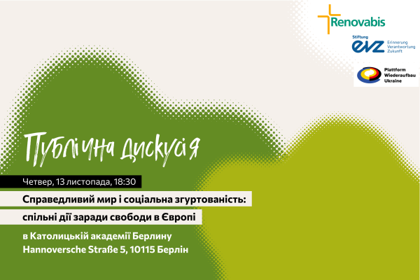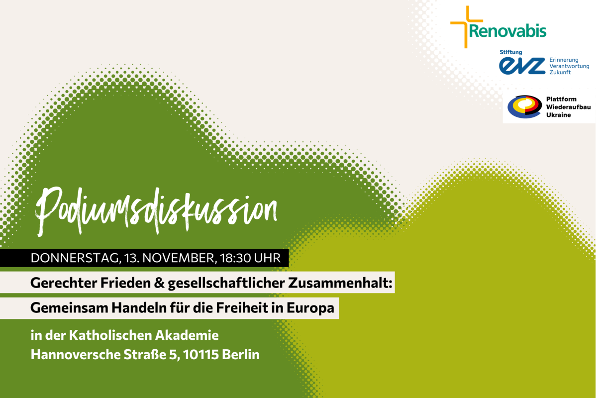 Щиро запрошуємо вас обговорити ці питання 13 листопада о 18:30 у Католицькій академії (вул. Ганноверська, 5, 10115 Берлін) разом із нашими учасниками дискусії.